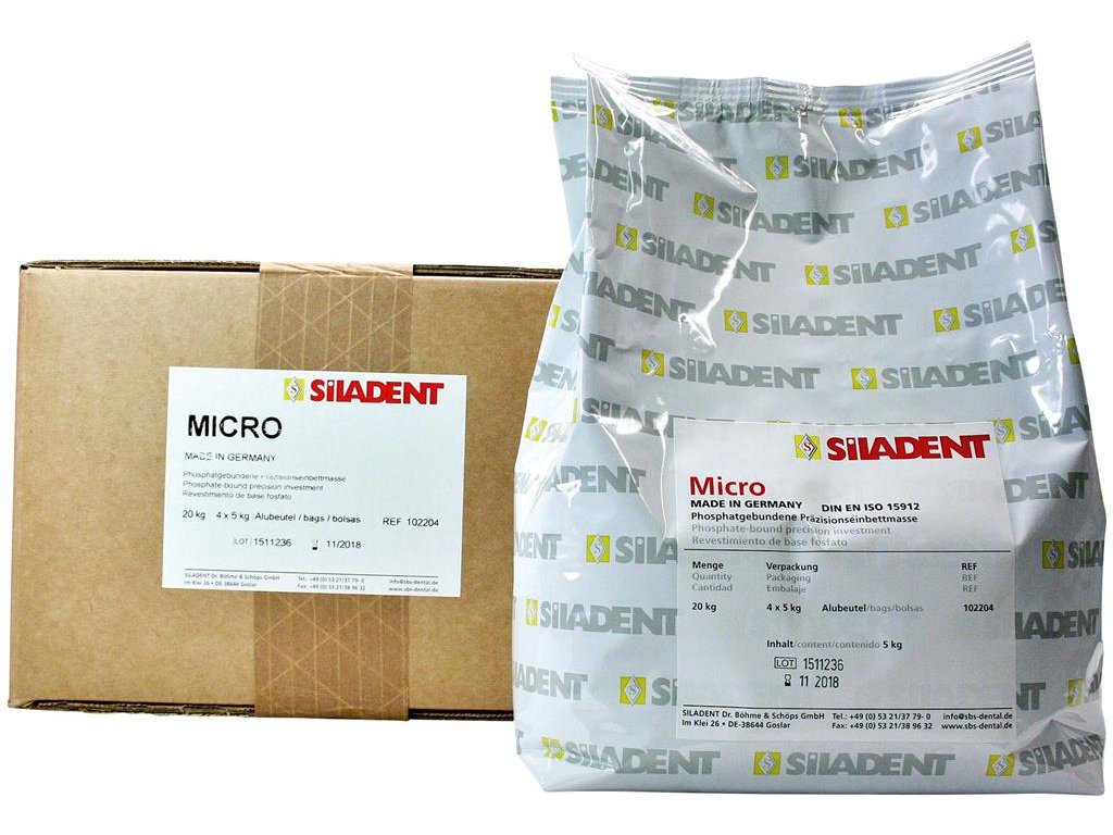 Zatmelovací hmota Micro má vynikající schopnost zatékání.Expanze je řízena díky koncentraci Expanzní tekutiny. Micro je fosfátová, bezgrafitová precizní zatmelovací hmota použitelná pro skelety, korunky i můstky, zvláště z obecných kovů.